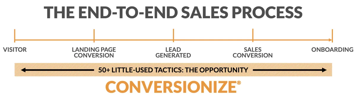 Where Is The Opportunity For Improvement? Most businesses focus on just two key areas of sales: lead generation and the actual sales meeting. Both can be significantly improved with CONVERSIONIZE as well as filling in all the gaps between a visitor arriving on your website or landing page right through to the sale and onboarding them. Very few businesses have a complete sales process (including over 50 proven 'CONVERSIONIZE Tactics') installed and that's the opportunity that CONVERSIONIZE taps into and why improved results are assured...